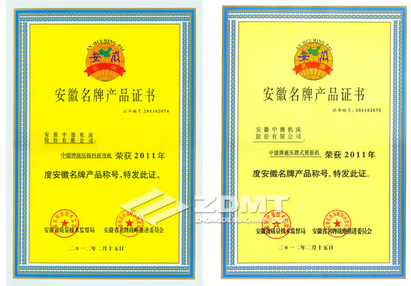 2012年3月22日,马鞍山市召开了全市品质手艺监视任务集会,集会对2011年取得质监部分相干声誉的企业与小我停止了惩处,我公司中德牌液压系统摆式液压折弯机和中德牌液压油缸板料折弯模具机两个产物别离经由过程了2011年“安徽名牌”的复审。
